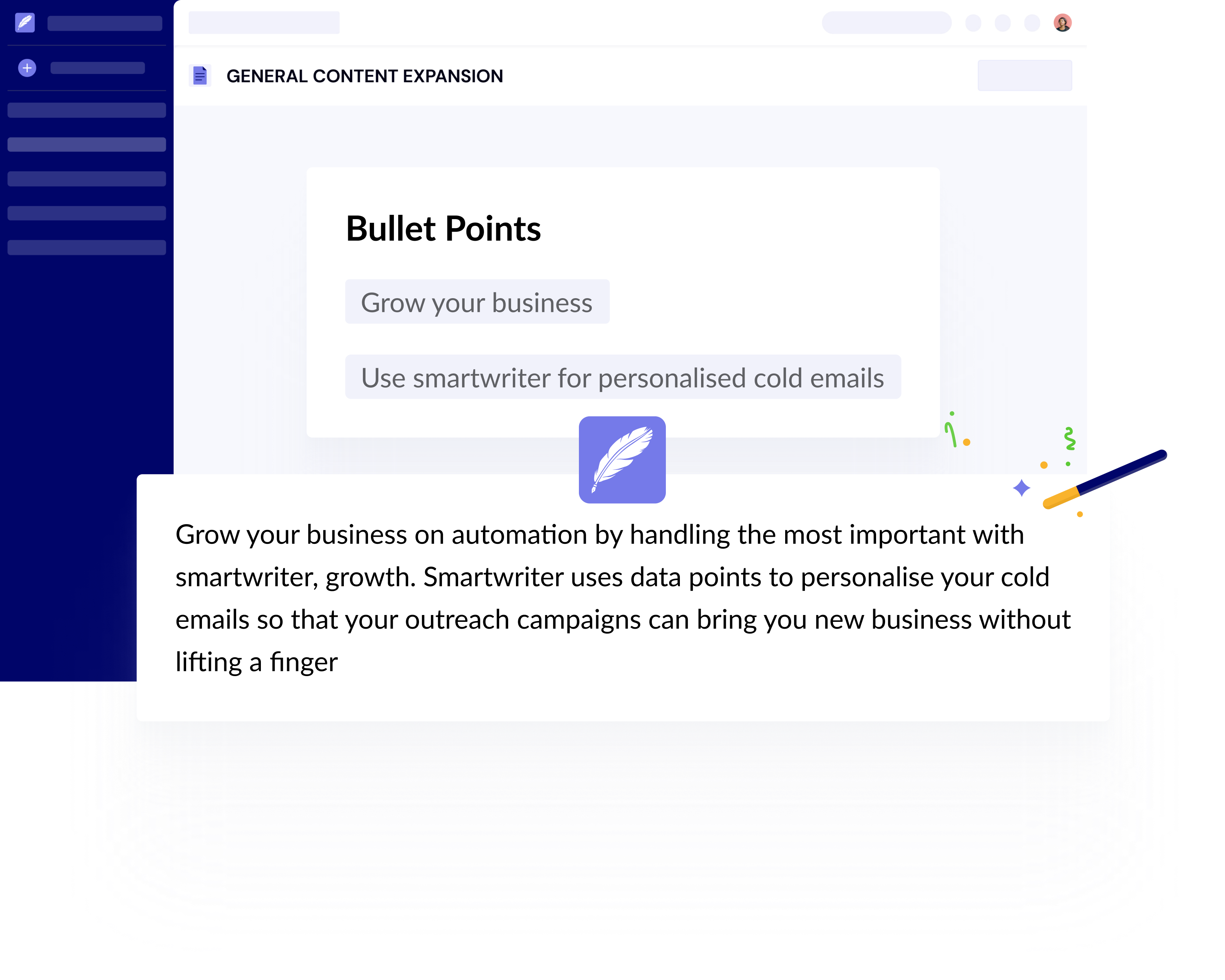 Currently, as online sales and marketing for companies grows, the need to research new marketing channels becomes more and more time-consuming. We feel that it's important to spend less time researching trends and more time closing deals. Smartwriter helps you do this by giving your team access to 100's of hyper personalised email templates that mean you always communicate in style.